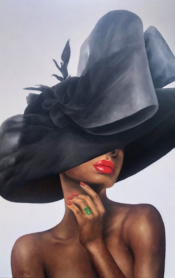 This was a commissioned piece based on one of my original paintings 'Sharp Relief' and was created from the clients brief of a black church hat, emerald ring on wedding finger and red lips and fingernails.