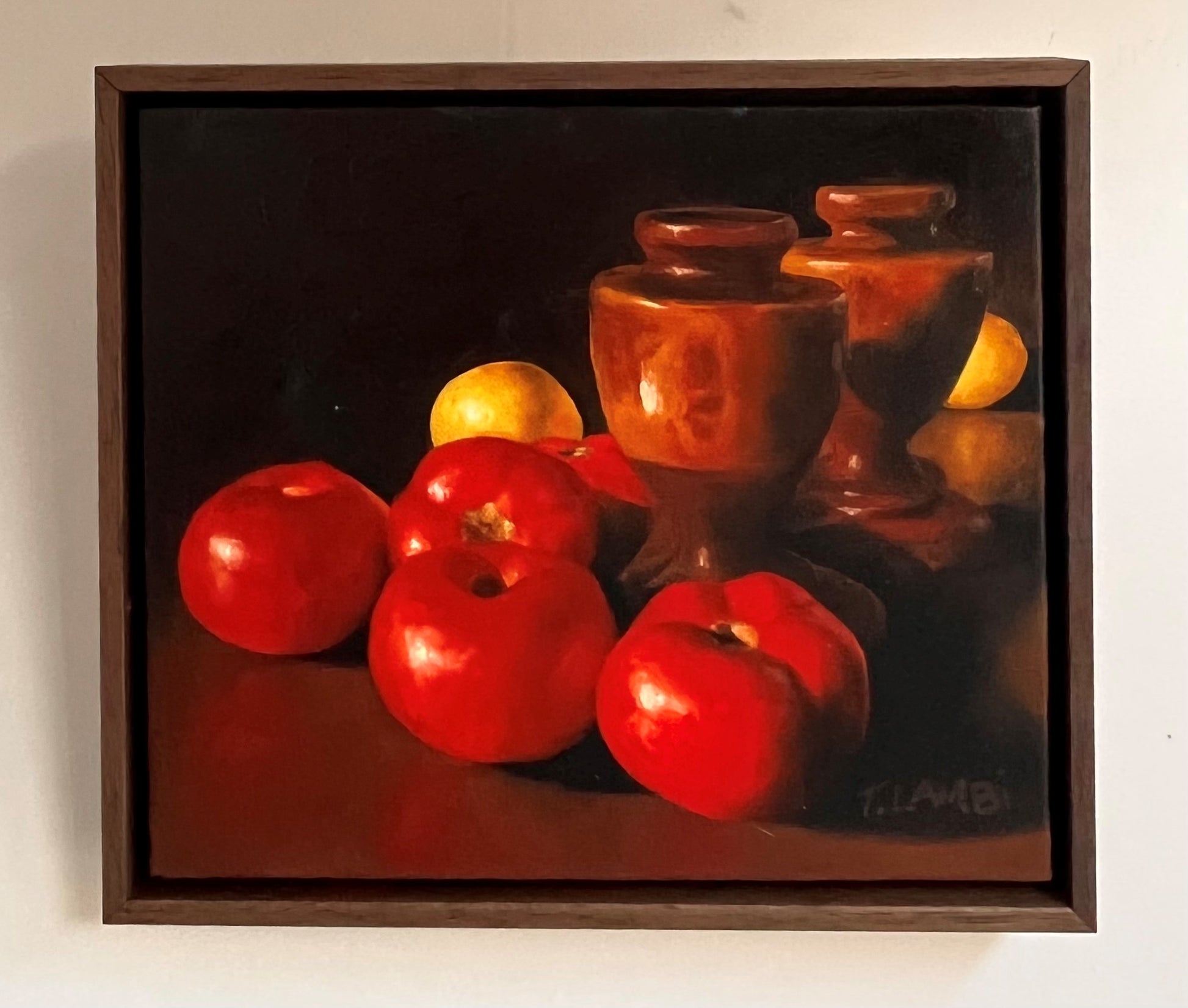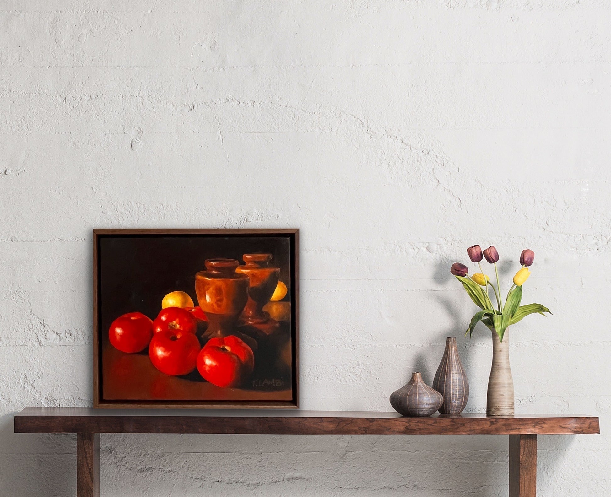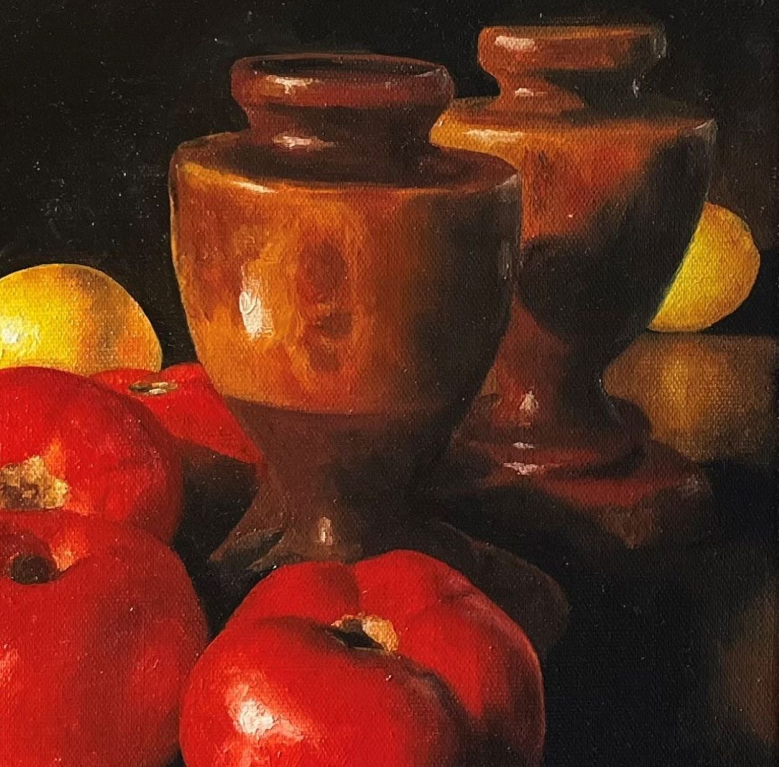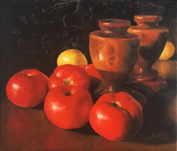 Whilst figurative painting is my first love, I also paint still life and I relish the effect of light on form. This tableau is painted from life in my light filled studio where the strong Australian light creates beautiful vignettes. It's made even more special with the addition of two wooden urns which were my parents' and were such a constant in my life growing up on the farm. Those two little urns were always in the background witnessing the chaotic life of a big loving family - the unconditional love, the laughter, the fighting, the joy, the sadness and ultimately the grief.