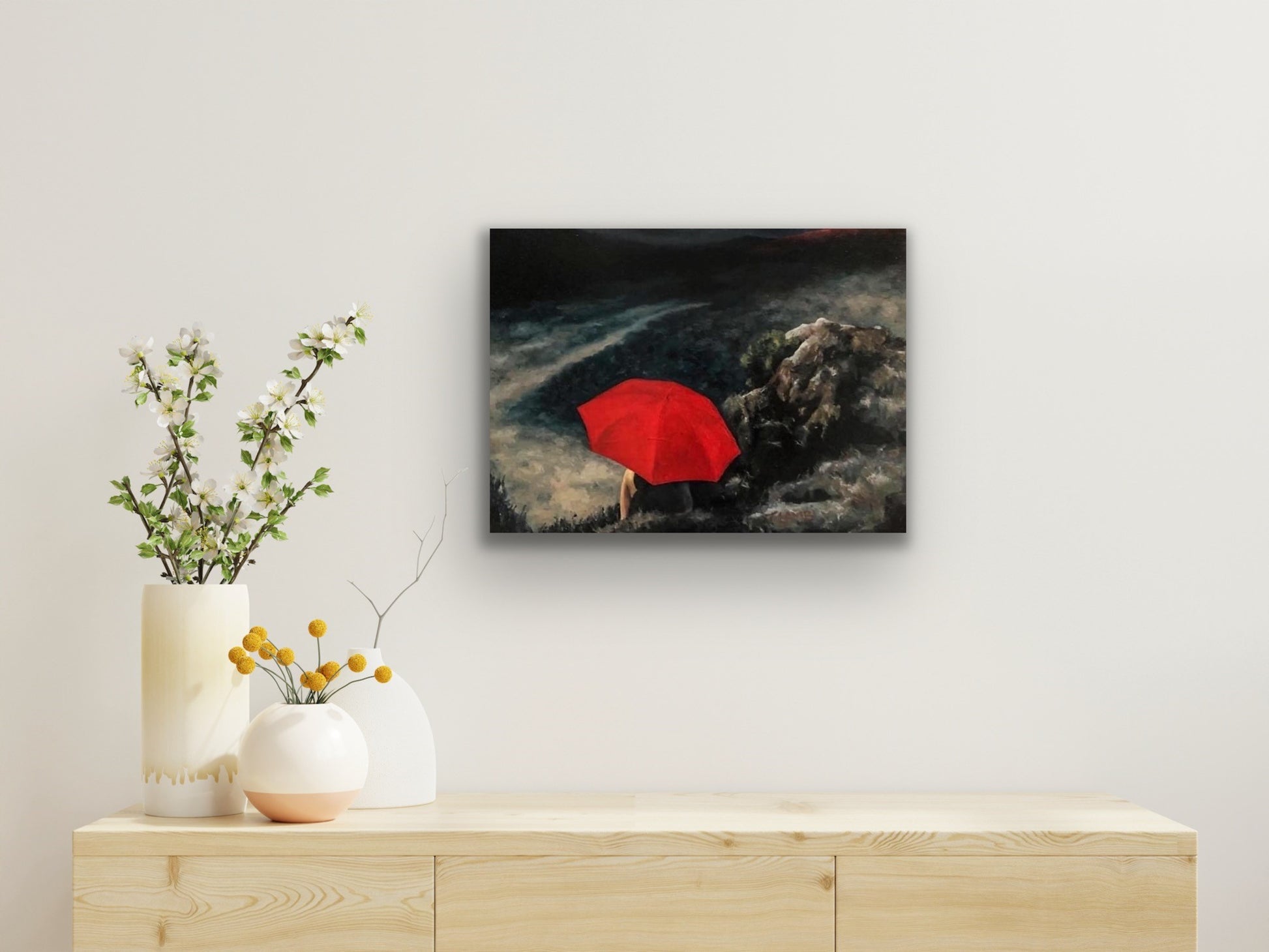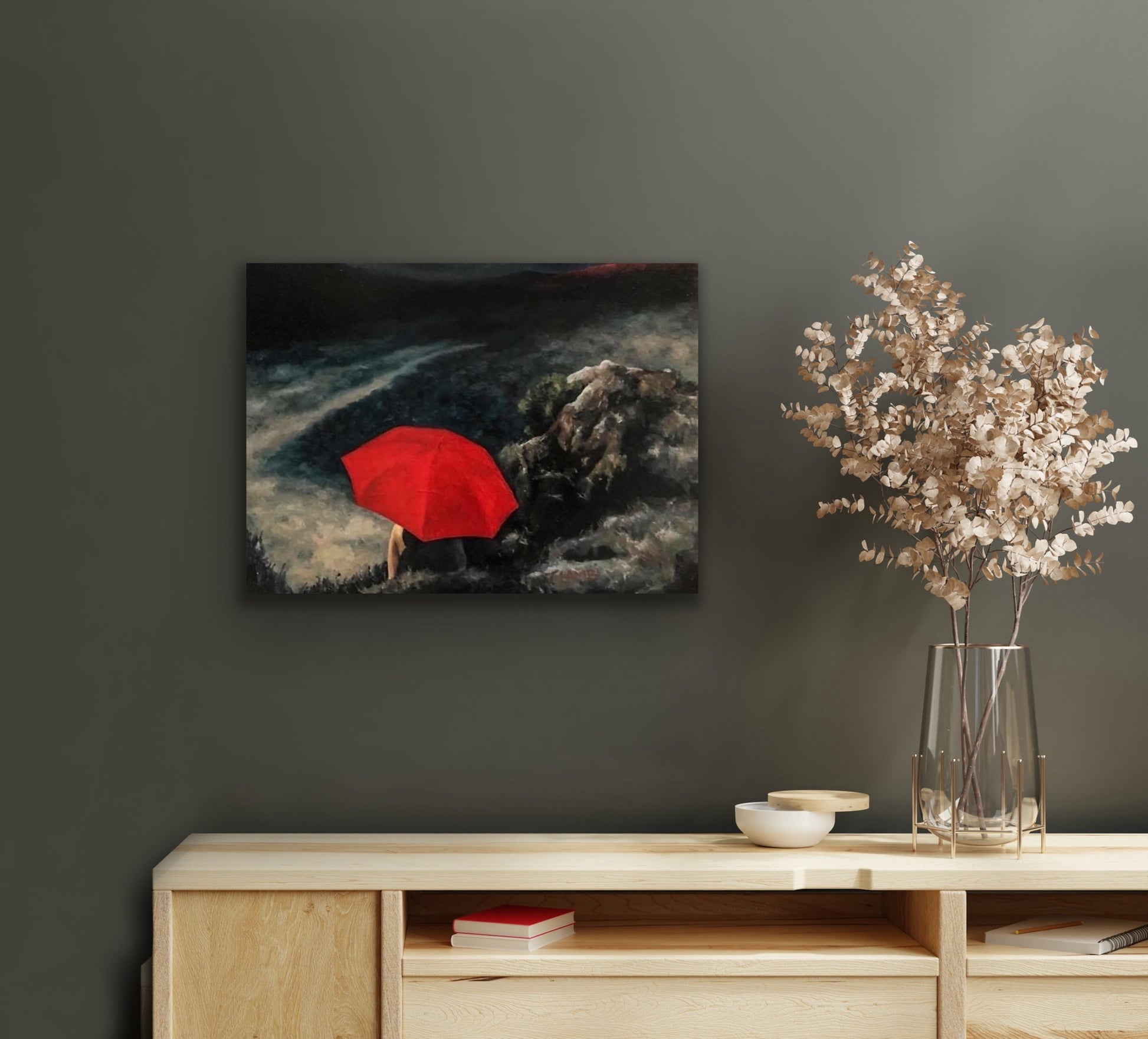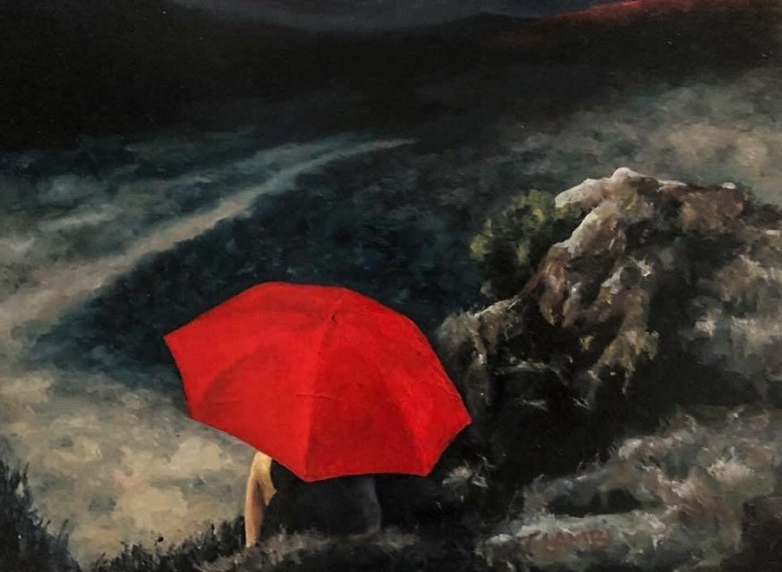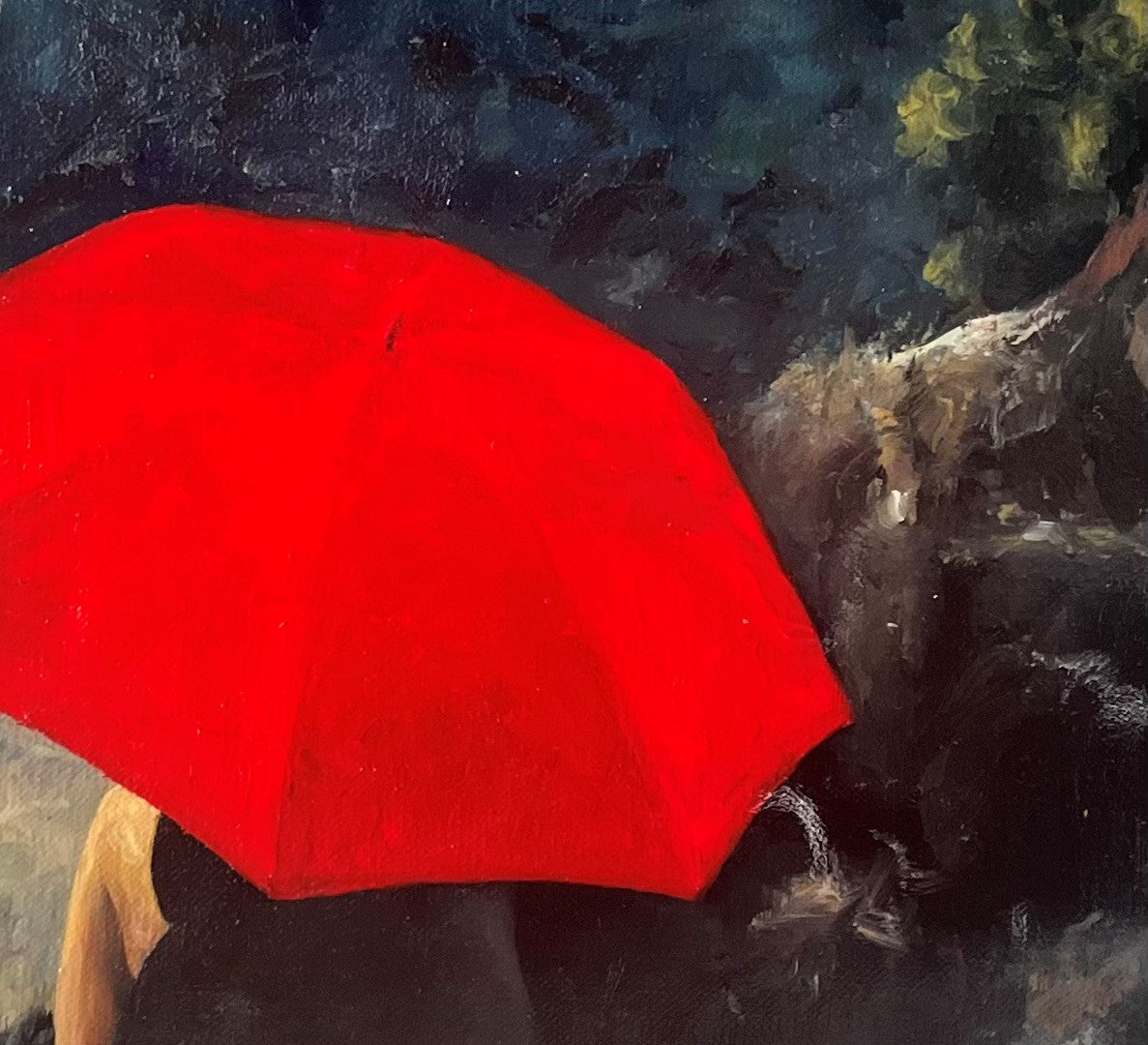 The red umbrella against the rather forbidding background signals a dash of optimism and hope as life continues on.