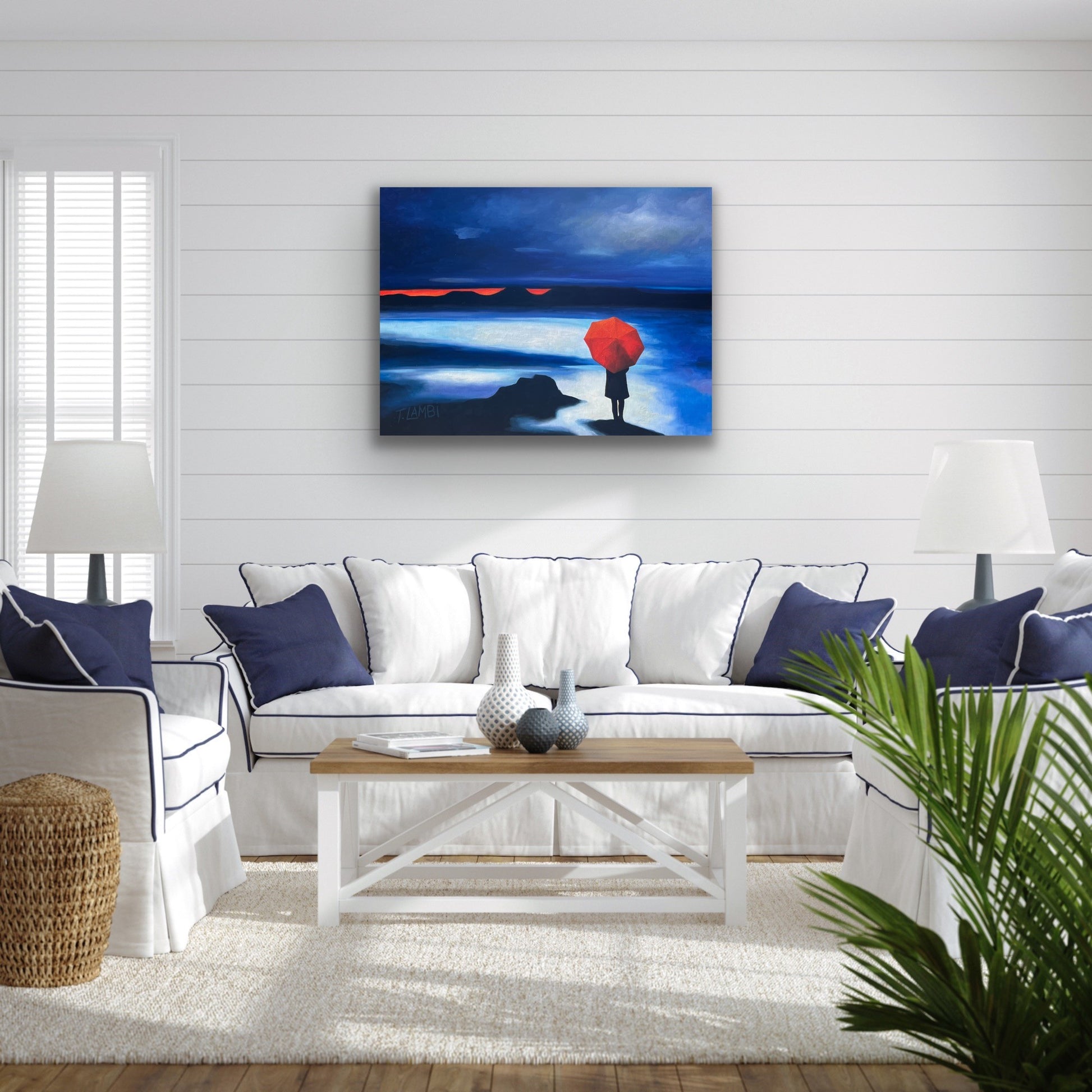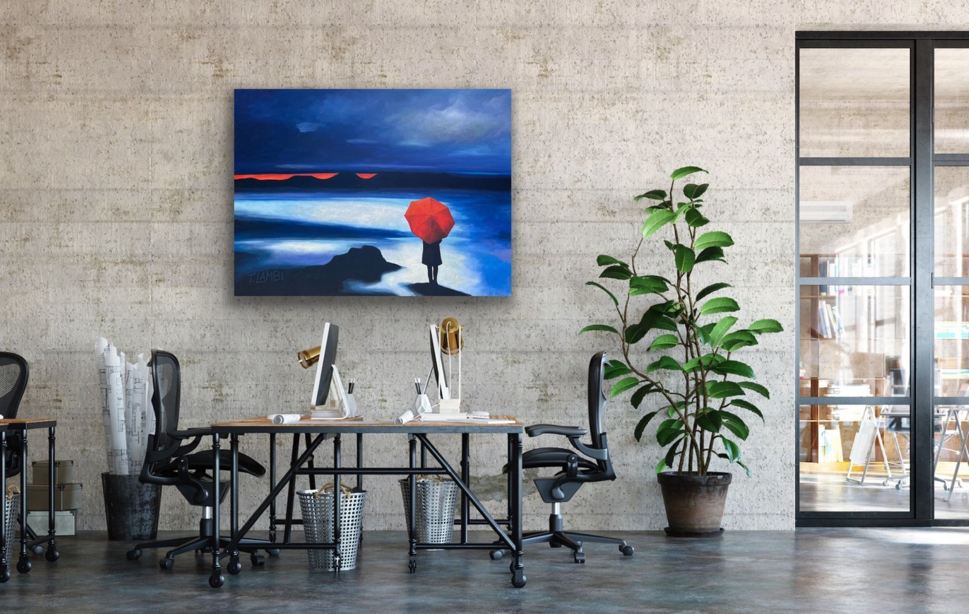 A return to my umbrella series, this painting captures a delicate balance between the warmth and fire of the setting sun and the cool, calm waters. The red umbrella is a symbol of hope and optimism, its vibrant hue standing out against the contrasting colors of the stormy sky and icy water. It represents resilience and reminds us that no matter the circumstances, there is always a glimmer of light and hope on the horizon.