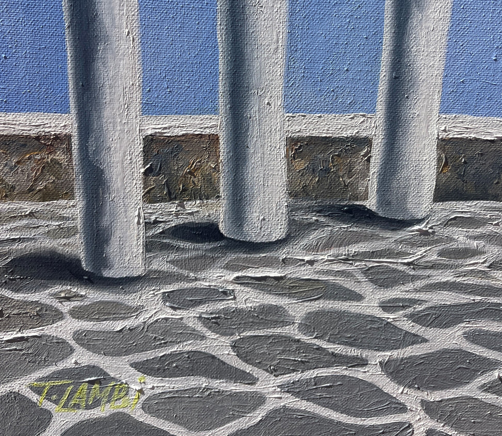 Inspired by a quiet moment at a little taverna high above the sea, “Through The Grapevine” is about capturing simplicity and stillness—how such spaces feel both expansive and deeply intimate. The painting stays with the viewer long after the moment has passed.