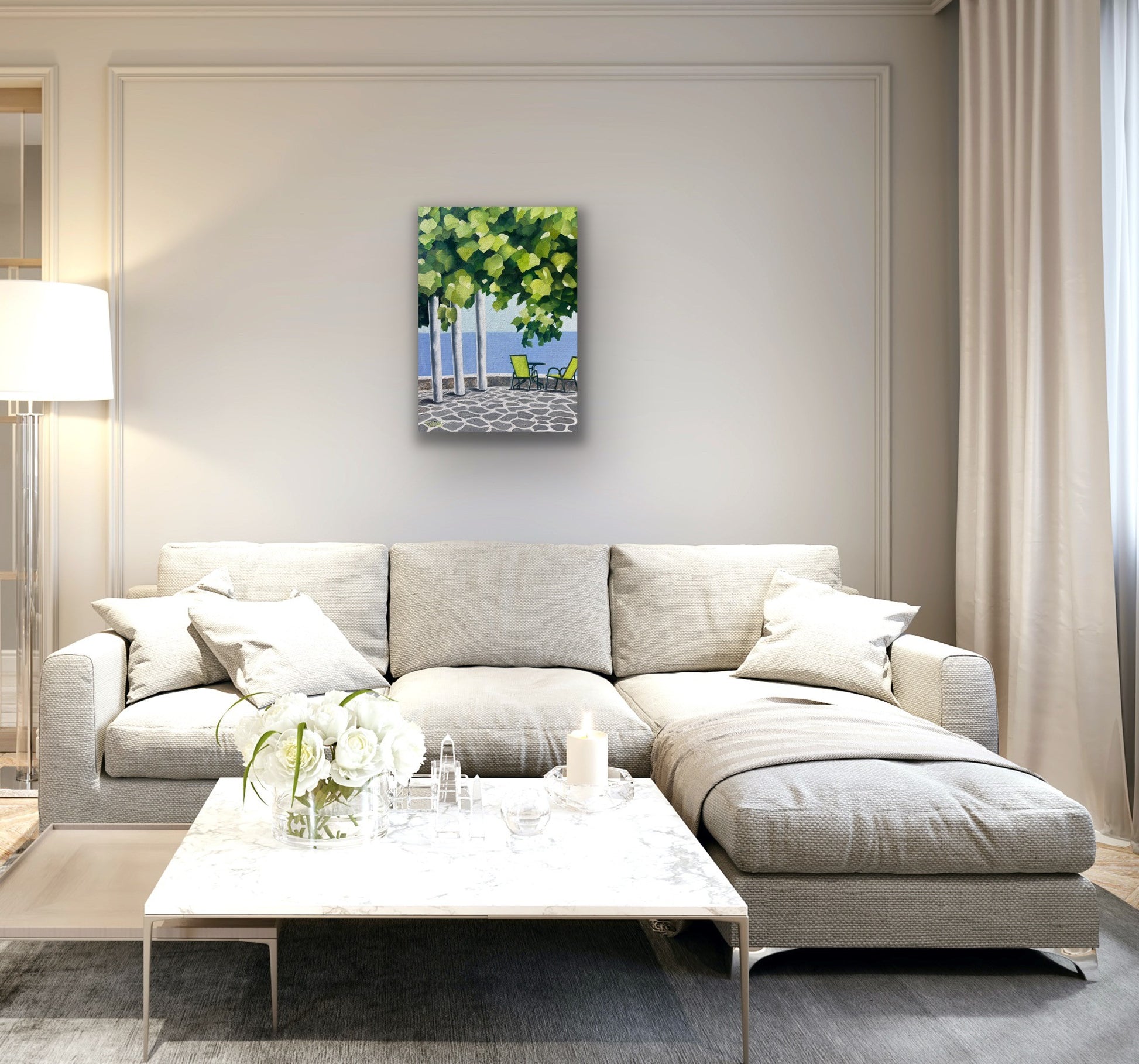 Inspired by a quiet moment at a little taverna high above the sea, “Through The Grapevine” is about capturing simplicity and stillness—how such spaces feel both expansive and deeply intimate. The painting stays with the viewer long after the moment has passed.