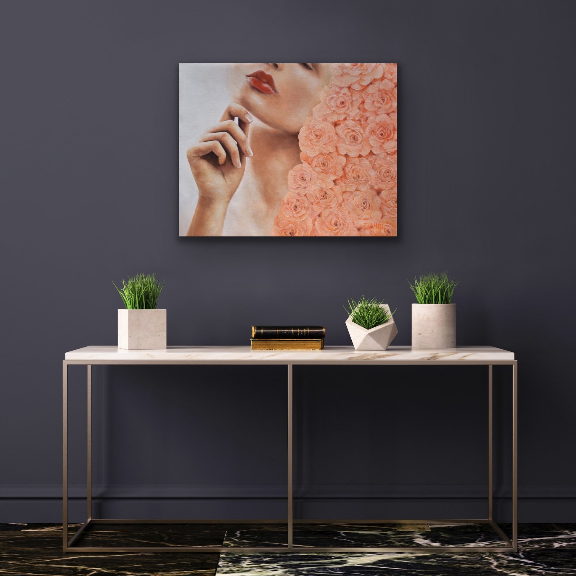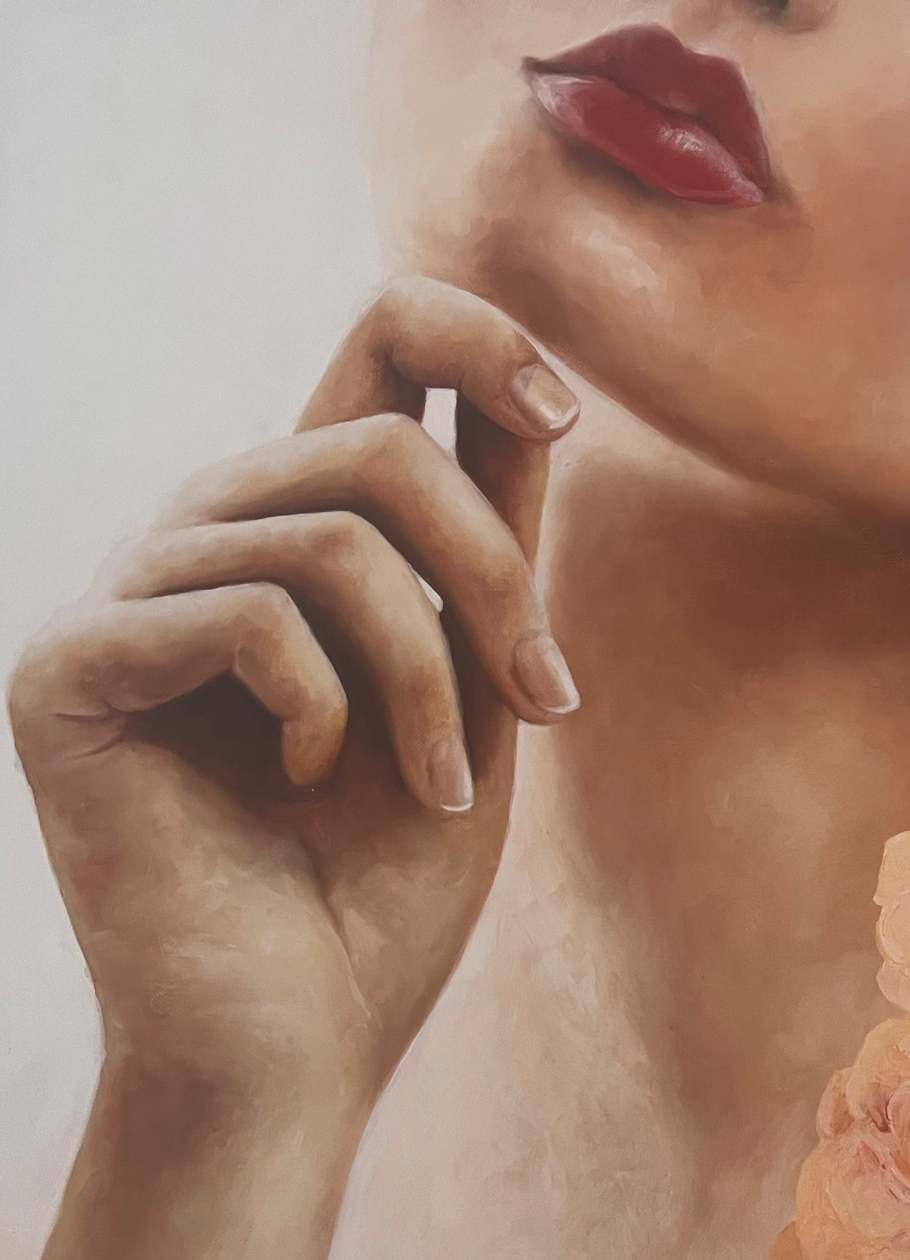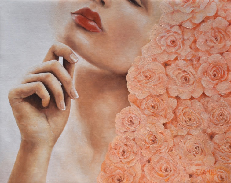 This is an earlier painting which was part of a series of works of catharsis following the deaths of my parents. My mother loved roses and had a beautiful rose garden which she tended passionately. She had many varieties and colours but the pale peach one always took my breath away. I used it in this piece to represent the beauty of both my parents while the pose of the model suggests the lifting of the veil of grief to allow some light in.